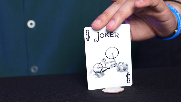 The magician shows two playing cards (Big Joker & Little Joker) and a coin, demonstrating how the coin vanishes and travels between the cards. When the spectator tries it themselves, the "magic" suddenly stops working. Just as everyone wonders what went wrong, the cards are turned over: the Little Joker has disappeared, leaving only a bicycle on his card... while on the Big Joker's card, the Little Joker is now clinging tightly to the Big Joker, exchanging an awkward glance.