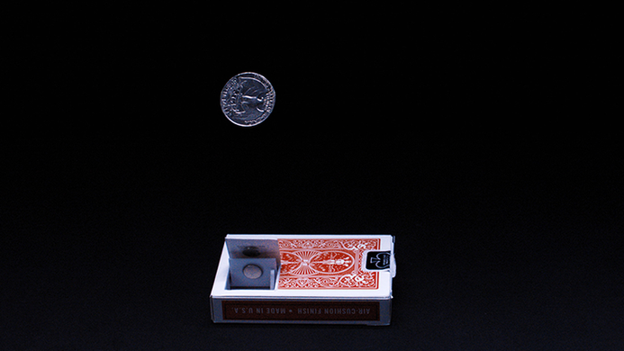 "Emergence" hides in plain sight inside a card box. Each set comes with the template needed to quickly modify any box of your favorite cards. The device itself is compatible with any currency up to the size of a half dollar and you have full control over both the timing and distance of the coin's launch. Get up to 250 shots on a single charge of the long-lasting battery.