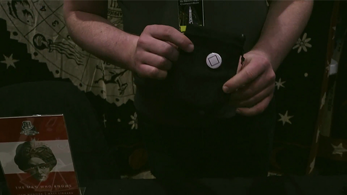 NANOMETER - The badges are tipped out onto the bag. From a line of ESP cards, a spectator freely chooses one and thinks of the symbol. They concentrate on it so hard that you reveal it, and then direct their powers to the badges... all of them drop off except for one - their chosen symbol is suddenly PINNED onto the bag!