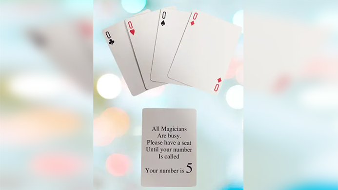 5 great specially printed Bicycle cards, printed by USPS. The Five of Diamonds has printed on the back "All Magicians are busy. Please have a seat Until your number Is called: Your number is 5". The Zero's have red Bicycle backs.