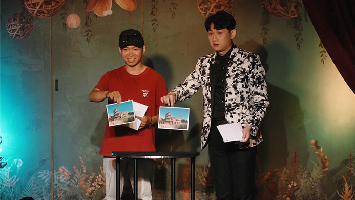 We've also considered how to make the matched postcards images more visible to everyone on stage. The custom storage package transforms into a stand for a presentation visible from the stage.