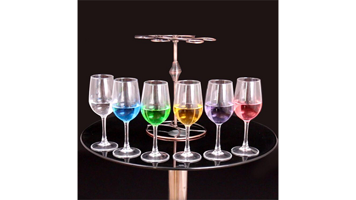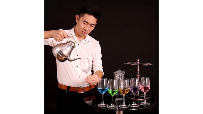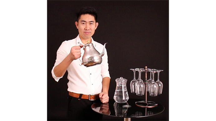 You display a beautiful tea kettle and empty glasses hanging on a beautiful display stand. You ask a random audience member to name any drink. You pick up and empty the glass and pour said drink from the kettle! Next, you ask another person to name another drink, you pick up another empty glass and pour their drink from the same kettle! You can repeat this over and over again, and each time the illusion becomes more baffling!