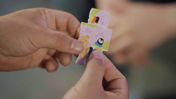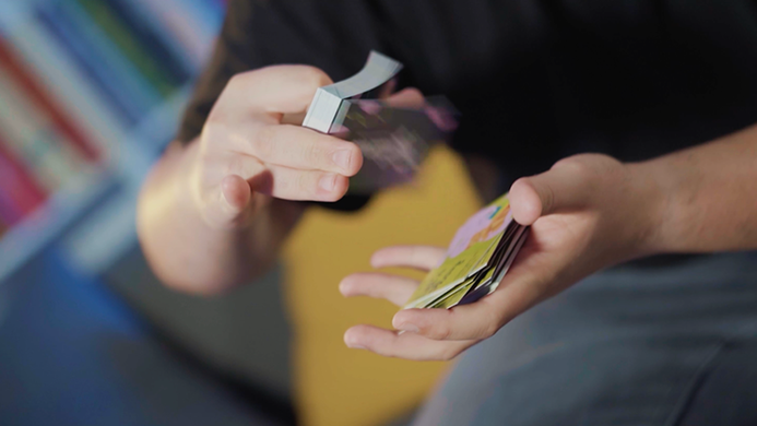 Now, the spectator thinks in one of the toys and the magician rips the card in different pieces, which are going to be used to restore it with the shape of the thought toy: a robot. That specially shaped card is INSTANTLY given to the spectator as a souvenir.