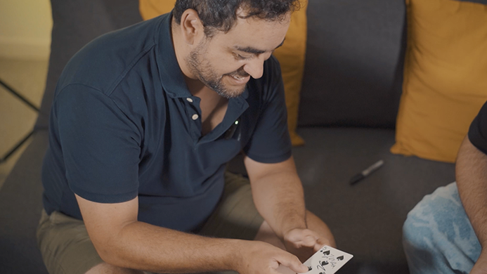 The spectator takes a card, signs it and puts it in the middle. Now, the magician says that he is not going to find the card, but the ink of the sharpie is the one which is going to find it.