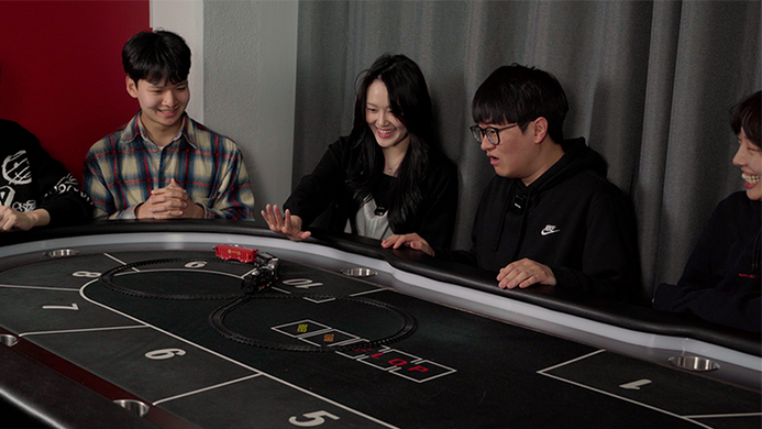 A toy car moves and then stops on its own. Look at the card where it stops, and it's the spectator's card.