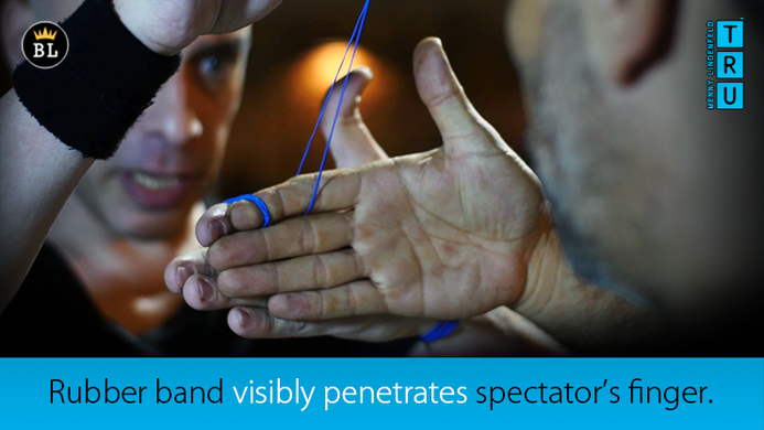A rubber band is wrapped around your forefinger. And while it's being stretched out, the rubber band literally PASSES THROUGH the center of your forefinger and LINKS ITSELF onto your middle finger. The effect is so visually stunning, IT LOOKS LIKE A CAMERA TRICK!