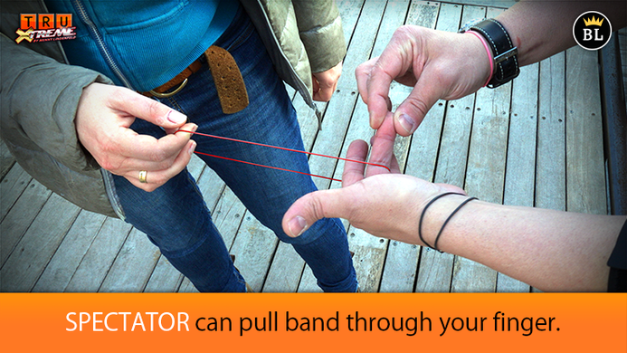 - While a spectator holds your fingertip, a rubber-band visibly links ON & OFF your finger. The band penetrates through your finger in the most visual and impossible way.