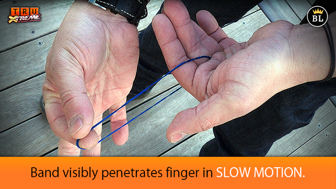 - With your palm upwards and flat open, wrap a RB around all the fingers. As you pull the band, it visibly melts through - one finger at a time.