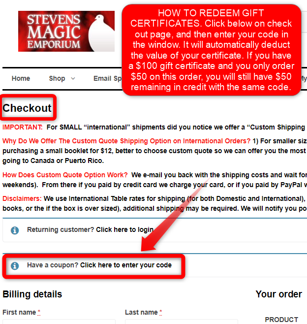 The default method is the person that purchases the certificate will receive an e-mail with a merchandise code. A generic example of what the code would resemble is: xrqqy5t4cckos Then when the individual wants to redeem either all or a portion of their allotted amount, let's say it is $100, they would place their order on the website and when they are checking out simply enter the code in the "Have A Coupon" window. If you order is only $50, you will still have $50 in your gift certificate account you can use on a future order. See additional image.