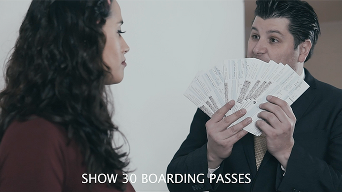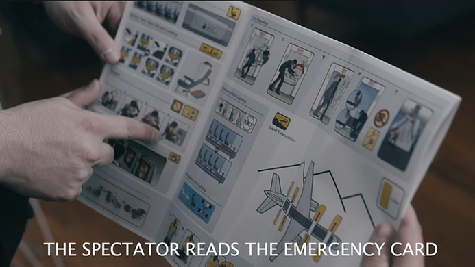A spectator is invited to participate in an amazing experience in which he will travel using his imagination. First of all, the magician mentions an item you find inside of an airplane that we always see, but we never read, and we should, we are talking about the emergency card. This is always located in front of our seats and we are too lazy to read it, but it can save our life in case of an emergency. This information is very important, therefore the magician hand out a real emergency card and invites the spectator to open it and actually read it, while the spectator does so, the magician addresses the audience to say that a destination will now be secretly chosen by the spectator. The magician now displays many boarding passes with different tourist destinations, boarding groups and seat numbers. The viewer selects one completely at random and the journey begins.