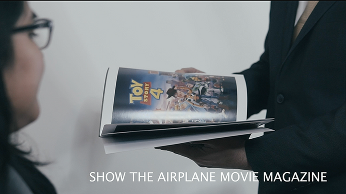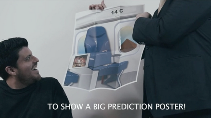 The magician now shows a tray with a bag and invites the spectator to say out loud the drink he has chosen (example: whiskey). When the magician lifts the paper bag, he has failed because there is only one orange box juice there. Now the magician continues and ask him to take the airplane magazine that has all the movies available inflight and to please secretly choose one. Now he asks him to focus on the film, the main actor, the soundtrack and other details, magically the magician begins to read the spectator's mind revealing one by one all the things he is thinking. Then the magician guesses the exact number of the airplane seat where he is on, his boarding group and finally the destination of the flight, city and country he is traveling to. At the end magician finishes with a question.