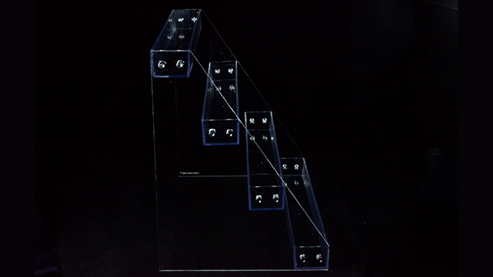 The Carat XCR4 is made of clear 3mm acrylic to provide a strong, sturdy structure while still being lightweight. The XCR4's design is based off of multi-tiered acrylic nail polish racks, but has been modified so that each tier is spaced far enough apart from each other to allow for clear, unobstructed views of all the decks being displayed.