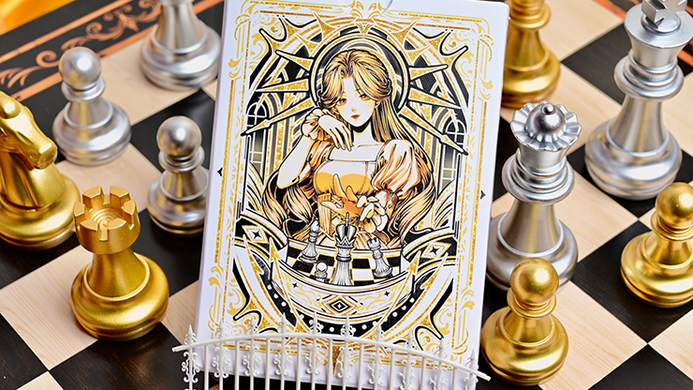 CHESS deck series is set in the 17th-century Baroque period of the Holy Roman Empire, creating a world view of a mirror-interwoven twin royal courts. The White Court is modeled after the Prague Crystal Palace, featuring Rococo-style gilded decorations and colorful glass domes; the black court is inspired by the Bratislava Fortress, presenting a dual image of dark red velvet curtains and bronze relief structures in the Gothic style. The two female chess players respectively control the two power systems of light and chaos, projecting a dual metaphor of royal power struggles and theological games in the chessboard confrontation.