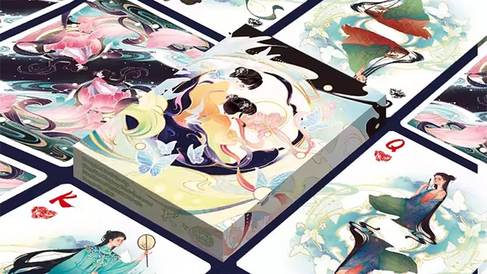 Since V1, the design of Flower Moon has been highly customized, especially the four colors, which are designed with the images of folding fans, ginkgo leaves, peach blossoms and butterflies. The outline of the picture still shows the shapes of spades, hearts, plum blossoms and diamonds, which also makes up for the regret that the V1 version cannot recognize the four colors. There are 12 human head cards, divided into three categories: J, Q, and K, representing the Tang Dynasty, Song Dynasty, and Ming Dynasty. The characters of each dynasty wear the clothes of the corresponding era. For example, the clothes of the Tang Dynasty were mainly chest-length glutinous skirts. The clothes of the Song Dynasty inherited the Tang Dynasty system, but the style changed, and the jacket was born. The clothes of the Ming Dynasty were more gorgeous, and the collar changed from a double-breasted collar to a stand-up collar.