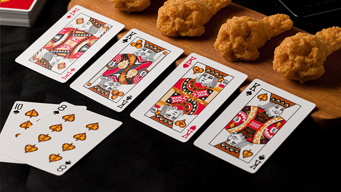 Fried Chicken playing cards is a new concept in playing cards and is made by MPC. Combining the great aroma of hot fresh fried chicken and a superbly engineered deck of slick playing cards, our 2 favorite things is a dream come true for us and likely, for many other people too.