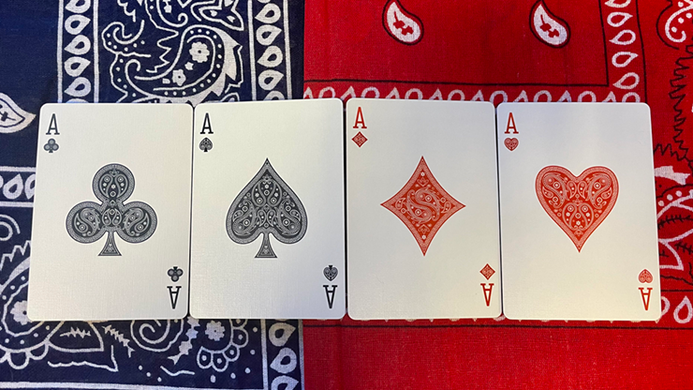 - Card backs graced with the gilded blue paisley bandana pattern.