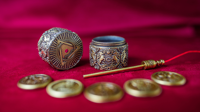 Five gold coins, each representing one of the Noble Virtues - Strength, Loyalty, Wisdom, Courage, and Honor - are threaded onto a cord and locked inside a sealed trinket box.