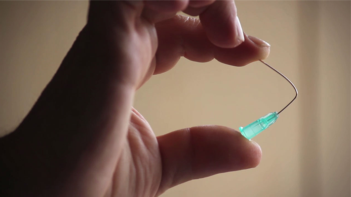 Here's what the audience sees: the magician places several needles on the table and asks someone to pick one up. They hold it by both ends between their fingertips with no more protection than their skin, and under these conditions, they are able to squeeze it until it bends without getting hurt.
