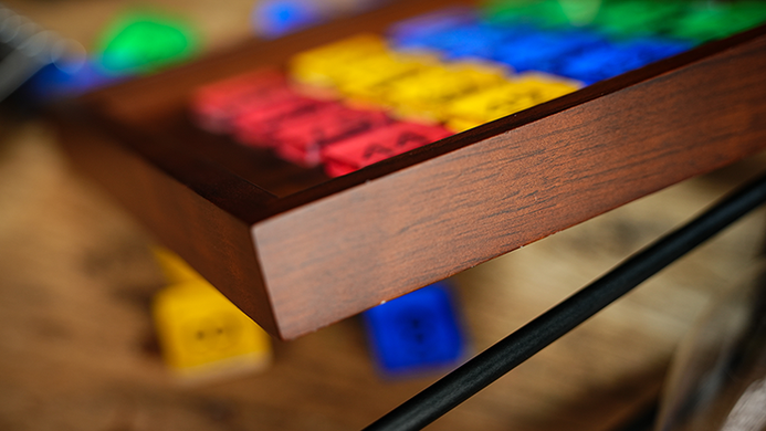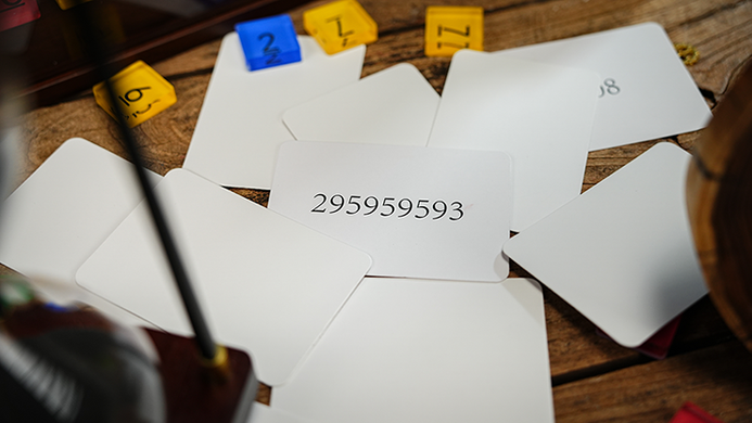 Your Audience Volunteer freely arranges the vibrant acrylic number tiles however they wish on a beautifully crafted walnut display board.