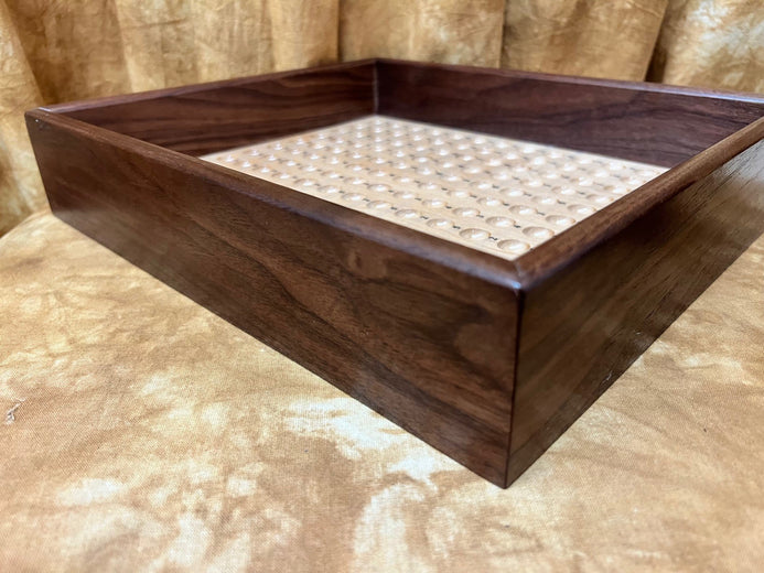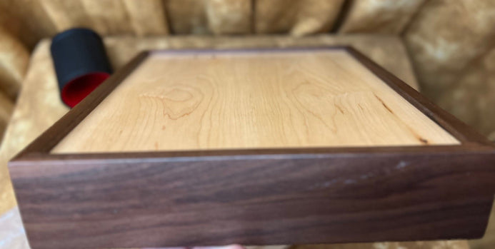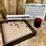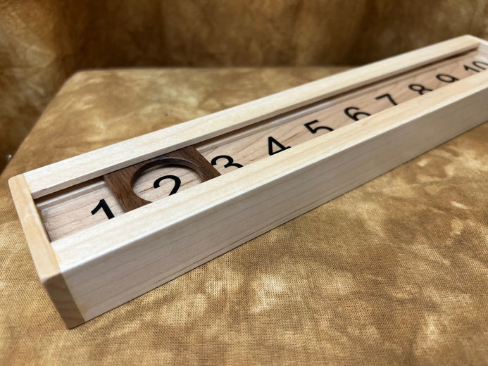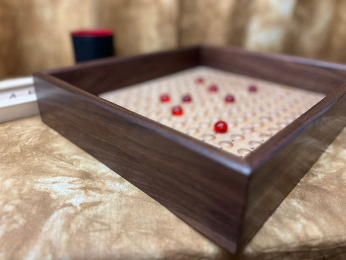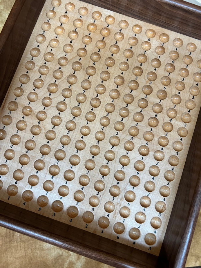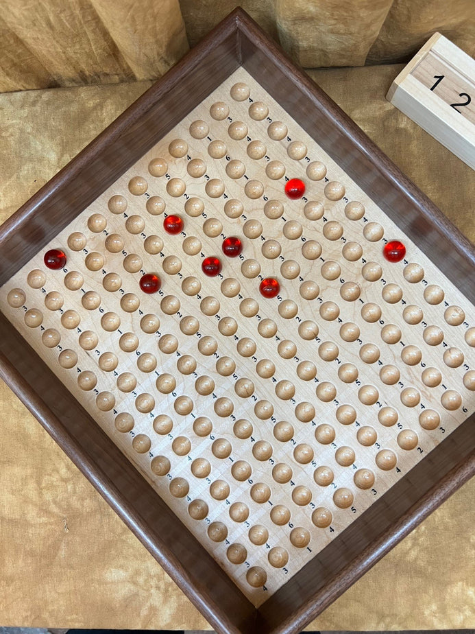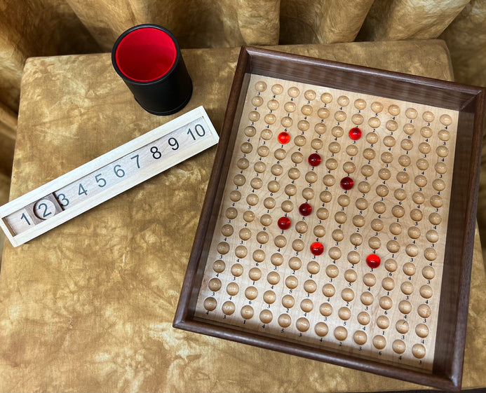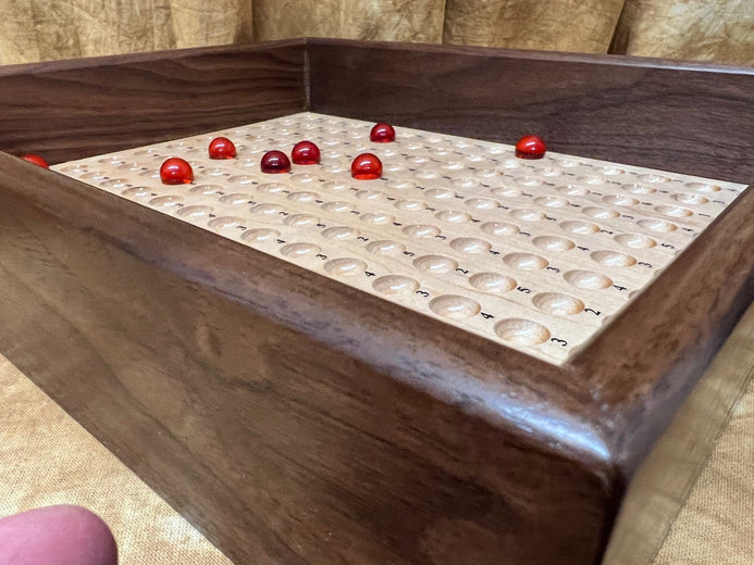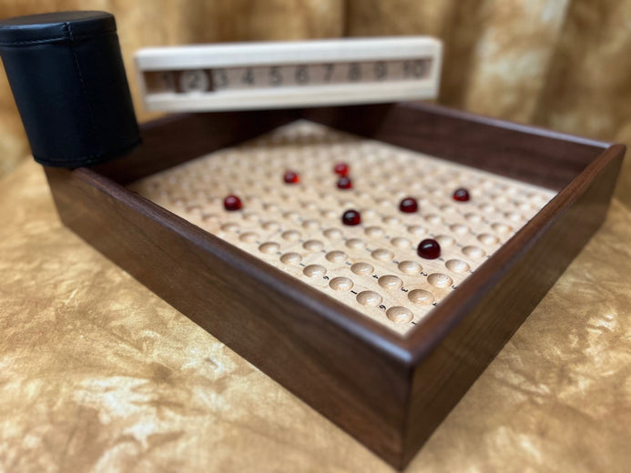 The unit made with care and attention by a true craftsman, from Walnut and Maple woods. Take a look at the additional photos to truly appreciate the attention to detail and quality. It's portable, precision made and very durable. Comes with cups, marbles and a heavy-duty numbered score unit (see additional photos), along with at least one laminated score card. We also provide you with (Special Thanks to Bill Taylor) a download (available post purchase) of the score card so you can have it for future reference if you choose to make back ups.