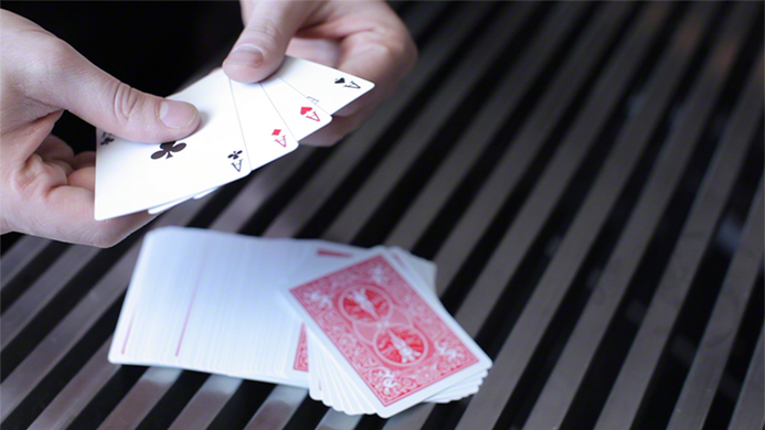 POG Production: 4 aces literally jump out of a tabled deck and into your hand with a single touch of an ungimmicked pack. This is a great way to get into a 4 ace routine.