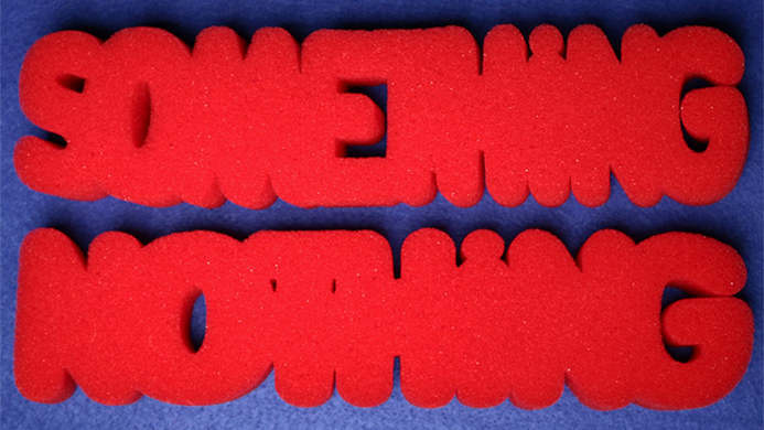 Imagine performing a sponge ball trick. After having had several sponge balls appear from your spectator's hands, you bunch up another sponge into their hand. Ask them if they have something or nothing in their hand. They tell you they have something. You bet that it's nothing. They open their hand to reveal "Nothing" - you were right!! Similar fun can be had with the other: "Do you think you've got something in your hand?" They reply, "Yes." They open their hand to reveal "Something" and you remark that they must have ESP! Much fun to be had with these!