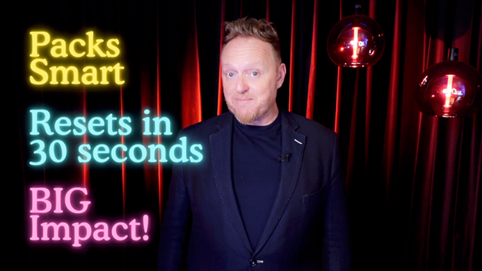 No angle restrictions, no special staging, packs smart, resets in 30 seconds anddelivers a BIG impact. Work away from tables and out of your pockets, making aninstant connection with your audience. Just pure, practical, magic.