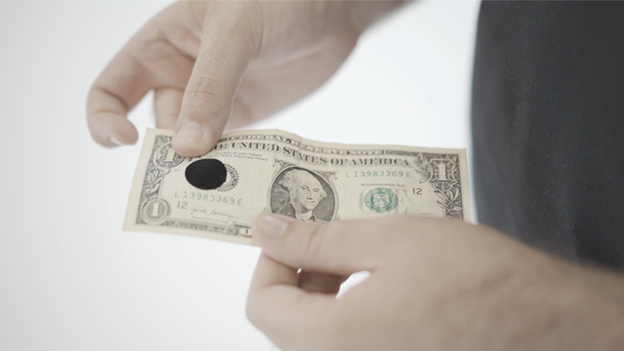Black Lips turns a simple black sticker into a real, physical black hole. A borrowed and signed bill receives a round black sticker... and that sticker becomes a Black Hole through which objects can genuinely pass.