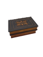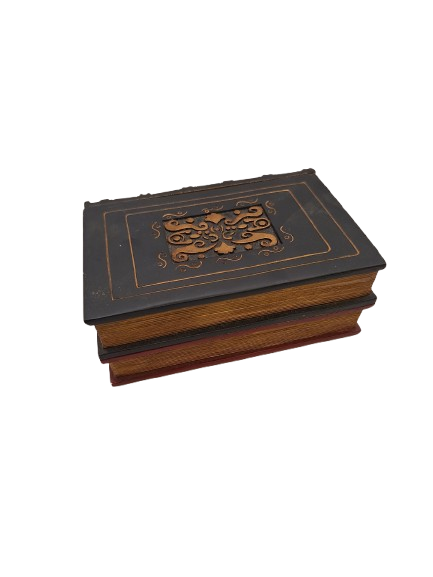 A “book” sculpted to resemble an antique leather-bound tome, complete with faux gilt edges and a convincing spine. When opened, it functions as a shadowbox with a deep crimson velvet-lined interior.