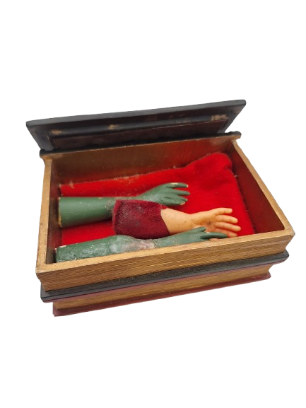 Emerging from the red velvet are three small, realistically sculpted hands—one pale flesh-toned and pleading, the others painted a decayed green and clawing outward.  If you're an aficionado of mentalism you know exactly what these little hands are used for.