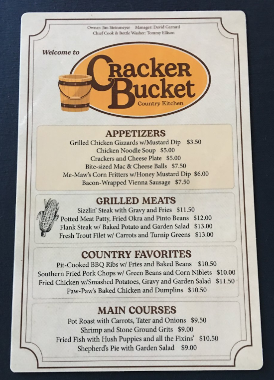 Effect: The magician invites a participant on stage. The magician then gives a another spectator a wallet that has been taped shut, along with a restaurant order pad. Next he hands the on-stage participant a menu. The magician explains that he is going to enjoy an imaginary dinner at the nationally known institution of country dining, Cracker Bucket.