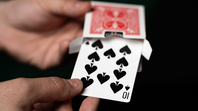 Fiedler's Flier is a secret weapon that you can always carry with you. Imagine having your spectator completely shuffling a deck of cards. Next, without ANY moves or sleight of hand a random card is selected. The spectator is asked to then shuffle the cards again in their hands. You ask them to go through the deck and find their chosen card and to their astonishment, the selected card has completely vanished from the deck! There is nothing to find! The card then reappears in the card box or virtually anywhere else the magician desires. The possibilities are unlimited! Here's another example directly from the instructions. The magician shows an envelope to be empty, seals it closed and a spectator sits on it. The selected card is vanished while the spectator is holding the deck. Miraculously, the envelope that the spectator has been sitting on is torn open and the selection is found inside!