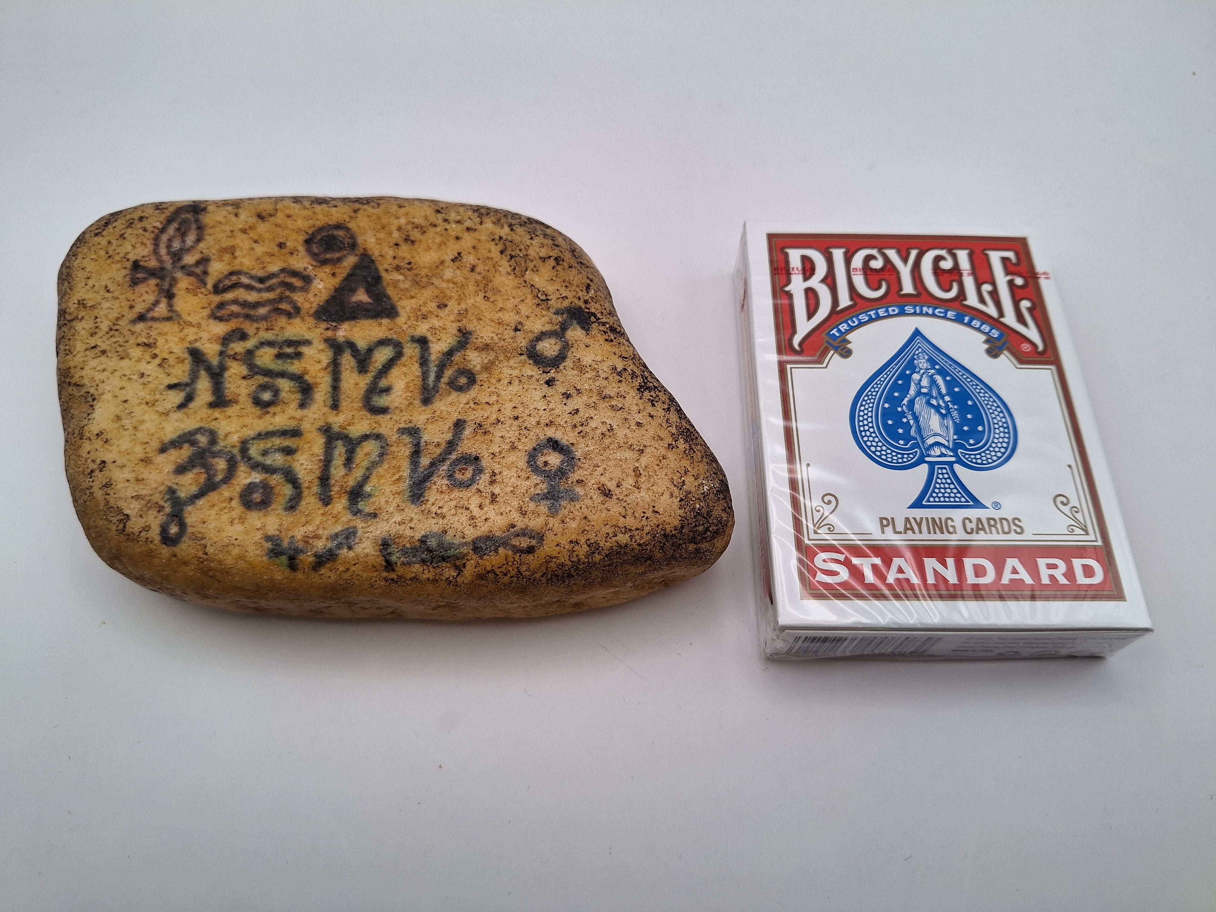 I was told by a great friend of Brother Shadow that this is one of the rocks he would find in his garden and make into magic props. This is obviously not real Cuneiform and is a fabrication of the language. One of a Kind.