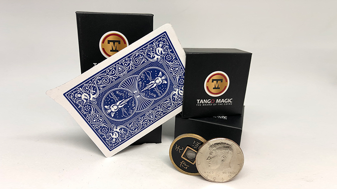 The magician shows a half dollar coin and a playing card. The performer taps the coin with the card and instantly the half dollar becomes a chinese coin, which can be completely examined by the audience!