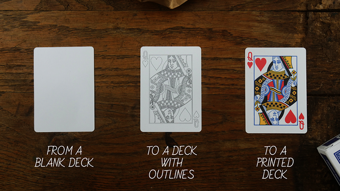 You introduce a blank deck. With a wave of your hand over the top card, outlines start to appear! You can now show that all the deck has transformed into an outlined printed deck.