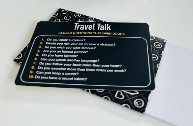 Then, you ask them ten deeply personal questions from the No Small Talk play card. They secretly commit to their answers. And somehow, their unique combination of answers matches your prediction perfectly.