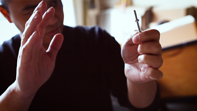 But Re-Volution takes this to a whole new level. The magician can choose to not even touch the nut and bolt -- he simply takes his pair of tweezers and picks it up to show it's completely hands free.