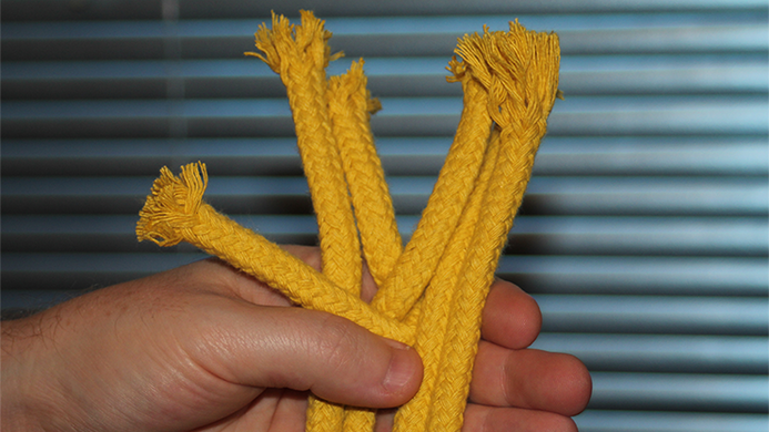 *All three pieces of rope used during the routine are tied together. One by one, the two knots are made to vanish, leaving one long length of solid rope -- just as you started at the beginning.