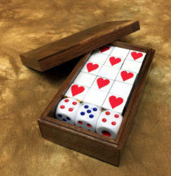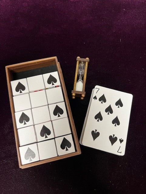 Don’t miss out on this one! A beautiful, handcrafted wooden box is shown, which contains several small cubes, of which there are different card pips on each cube. (None matching). The performer then takes the lid and covers the box and has a card selected. The spectator is told to concentrate on the card and it’s pips…and then the spectator is told to take the lid off the box and magically, the once assorted cubes are now assembled in perfect color and order to reveal in splendor the picture of the chosen card!
