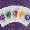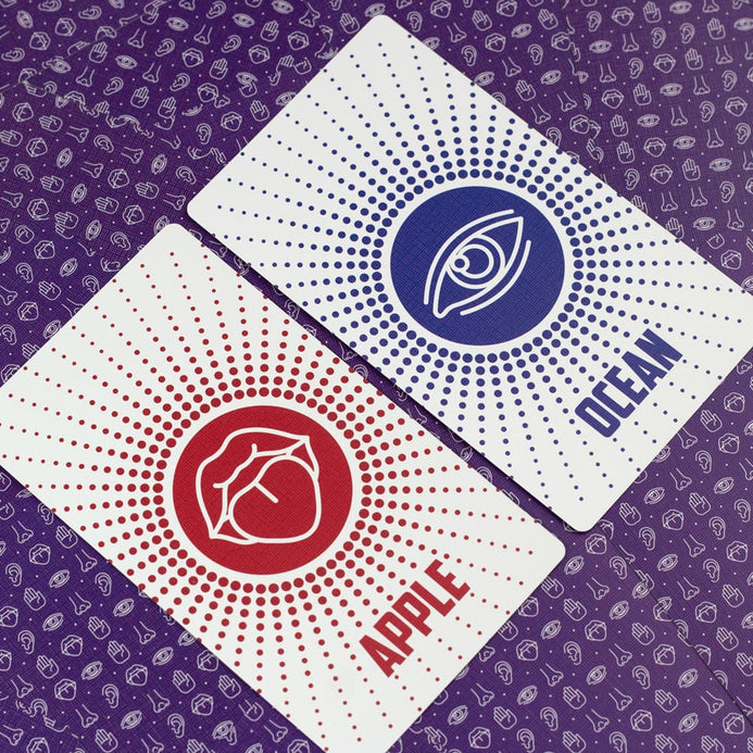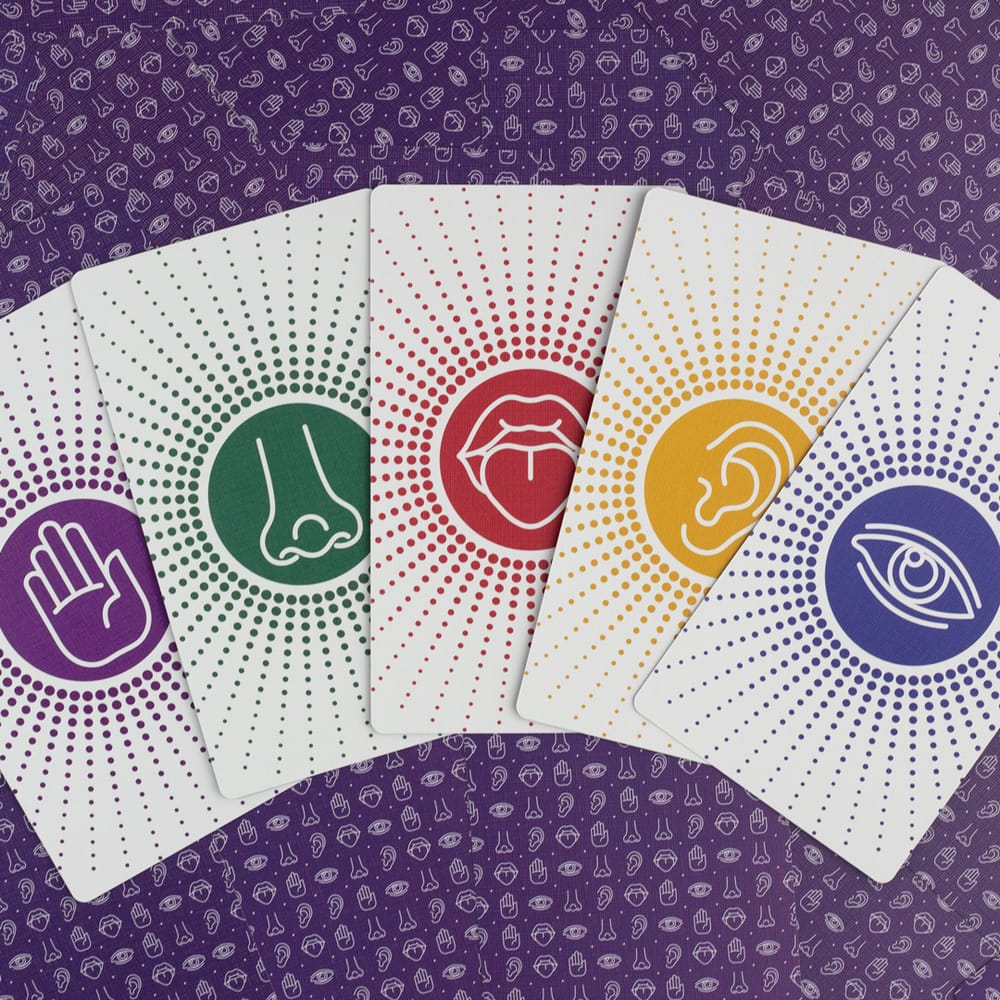 Each card in this deck represents one of the five senses: touch, smell, taste, sound, and sight. These are symbolized by a hand, nose, tongue, ear, and eye.