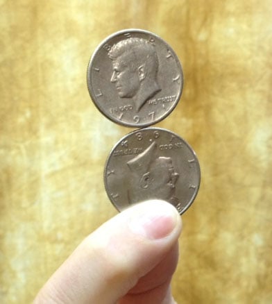 Effect: Performer attempts an unreal effect by taking two half dollar Kennedy coins and attempts to stand one on top of the other until it is actually "balanced" on top of the other coin. After a little effort in fact this impossible feat happens but what happens next takes this effect exponentially in a different direction. The magi, can actually flick the top coin that is balancing on top of the lower one and in doing so the coin visually spins in a circular motion - without falling off the coin.