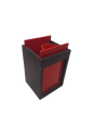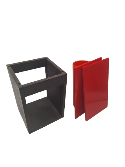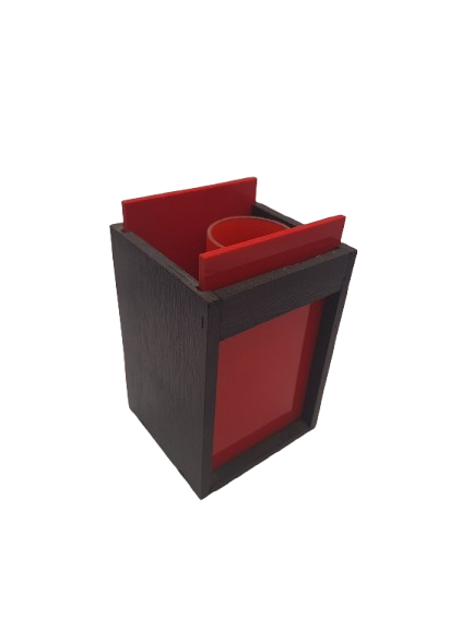 A small black wooden box with red plastic doors is shown empty. Silks, ribbons, and skinny balloons can be produced from within. Includes instructions. Very good.