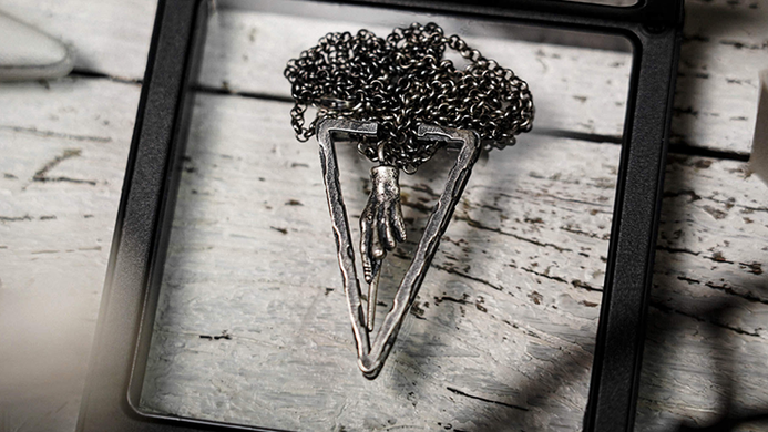 The original design of The Frame was rectangular, surrounding a pendant shaped like a mechanical robot. However, Terry was later inspired by the Deathly Hallows from Harry Potter and modified the frame into a triangle to resemble the Cloak of Invisibility. The pendant features a magic wand, a quintessential wizard's item, and the audience member's ring represents the final missing artifact of the Deathly Hallows - the Resurrection Stone.