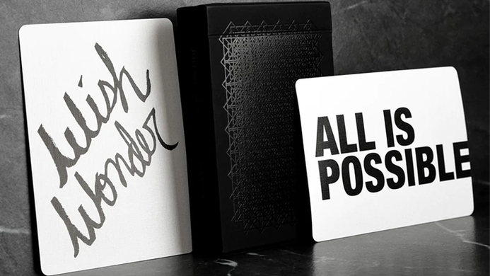 Packaged in a luxurious soft touch black box, pressed with a tonal black foil. The Wish Wonder Deck represents an infinite network of possibilities and two poetic manifestos to ponder. The back design is a visual representation of possibilities and an abstraction of infinite windows. Magic is Real. All is possible.